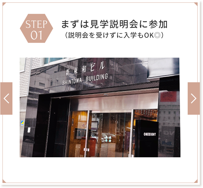 [地下鉄御堂筋線]の『心斎橋駅』の「北改札」を出て右に歩きますと地下街「クリスタ長堀」にでますので、地下街を右に歩いてください。歩く歩道の横を通ると正面にフィッシュ広場が見えてきます。広場の右側「北11出口」のエスカレーターを上がってください。エスカレーターを上がったらエスカレーターの進行方向と反対側に信号のある交差点が見えますので、信号を右折し、その次の角を左折したらすぐ右手に「新東和ビル」が見えます。エントランスを入って正面にあるA棟エレベーターから2階にお進みください。